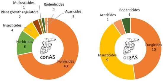 A total of 60 conASs and 23 orgASs were authorized for grapevine production in Austria (Figure 5). ConASs were dominated by fungicides (72% of conAS), herbicides (13%), insecticides (7%), and plant growth regulators (3%). Molluscicides, rodenticides, and acaricides each made up 2% of the conASs. The orgASs were dominated by fungicides (47% of orgASs) and insecticides (43%); acaricides and rodenticides delivered 5% to orgASs.