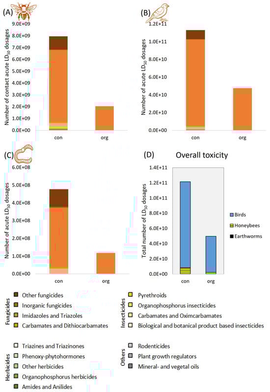 Considering honeybees, earthworms, and birds, a total of 1.2 × 1011 LD50 doses per year were delivered in conventional grapevine production, whereas 0.5 × 1011 LD50 doses were delivered in organic production (Figure 6D).