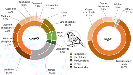 The aim of this study was to assess the potential ecotoxicological impact of ASs in conventional and organic apple and grapevine production. For this purpose, we used data on pesticide application in Austria from 2017, the most recent dataset. We assessed the potential impact on honeybees, birds, and earthworms, as these are common in European agroecosystems and are often used as surrogate species in environmental risk assessments during the approval process of ASs. This approach is novel as we used the rarely available crop-specific pesticide use data to make an evaluation on three important non-target organismic groups that have different functions in agroecosystems [32].