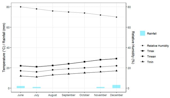 The research was conducted at Universidad Nacional Agraria La Molina, in the district of La Molina, Lima Province, Department of Lima, Peru. The experimental plot is located at 76°56′21″ W and 12°04′55″ S, with an altitude of 247 m.a.s.l. The average temperature during the study period was 19.89 °C, with a relative humidity of 79.43% and no recorded rainfall (0.8 mm∙h−1). The Alexander Von Humboldt Meteorological Station provided the meteorological data (Figure 1).