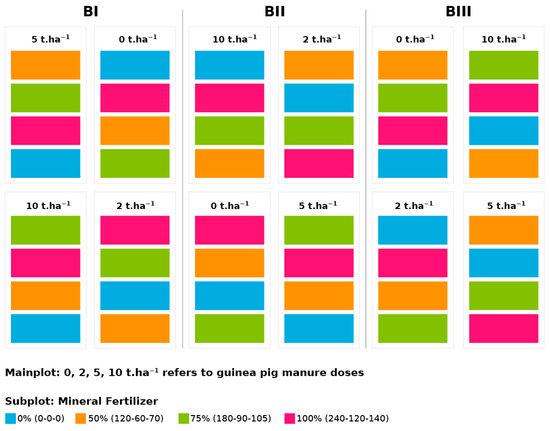 The experiment used a randomized complete block design with a split-plot arrangement and three replicates. The main plot, with an area of 120 m2, corresponded to the application of guinea pig manure at four rates, while the subplot, covering 30 m2, consisted of the application of four percentages of the recommended N–P2O5–K2O fertilization dose (Figure 2). The combination of these two factors resulted in a total of 16 treatments.
