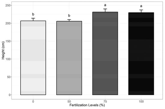 The variance analysis revealed no significant interaction effects; however, significant differences were observed in the main effect between mineral fertilization doses over plant height (p-value < 0.01). The plants receiving 75% and 100% mineral fertilization showed the greatest heights, reaching 229.67 cm and 231.25 cm, respectively (Figure 3).