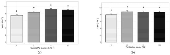 No significant interaction effects were found between the two factors. However, a significant main effect was observed for the guinea pig manure factor (p-value < 0.05). Treatments with 5 and 10 t∙ha−1 of manure achieved the highest yields, increasing by 18% and 17%, respectively, compared to the treatment without manure (Figure 5a). Regarding the mineral fertilization factor (p-value < 0.01), the highest yields were obtained with 50%, 75%, and 100% of the recommended dose, resulting in up to a 10% increase in yield compared to the unfertilized treatment (Figure 5b).