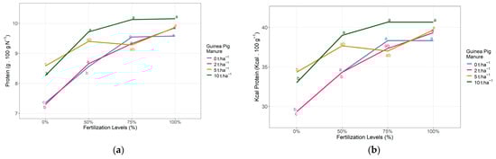 The highest protein contents—10.12, 9.71, and 10.15 g∙100 g∙N−1—were obtained with the fertilization doses of 50%, 75%, and 100%, respectively, in the treatment involving 10 t∙ha−1 of guinea pig manure alongside fertilization. However, it is important to note that no significant differences were found between these fertilization doses (Figure 6a).