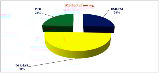 During the period of the experimental study (May–October 2024), the maximum and minimum temperatures ranged from 36 to 46 °C and 14 to 23 °C, respectively. June reported the warmest month with a temperature of 46 °C, whereas the lowest minimum temperature was observed in the month of October. The total rainfall received during the study period (May–October 2024) was about 404 mm, with highest rainfall (248.0 mm) being observed in August. During the summer of 2024, coarse rice was cultivated on about 1.17 lakh ha and basmati (an aromatic rice with a GI tag) was cultivated on an area of 0.72 lakh ha; the total net cultivable area in the district was 2.18 lakh ha. The direct seeding of rice was practiced on about 1150 ha during the summer of 2024, while the remaining area was subject to the PTR method. Out of the total 165.4 ha area surveyed in eight villages (52 locations), 50% of the area was sown using the DSR-IAS method, 26% with the DSR-PSI method, and 24% with the PTR method of rice establishment (Figure 1). Furthermore, soil occupied about 15, 40, and 45 per cent of the area, with coarse loamy, coarse loamy and fine loamy associations, and fine loamy soil types, respectively. In general, soils exhibited a slightly or moderately alkaline reaction, had a low-to-medium organic carbon status, and presented with a fairly good availability of P and a rich availability of K. The micronutrients, viz. Zn, Fe, and Mn, varied from low to medium, with the optimum availability relating to Cu [21].