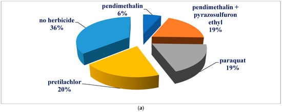 In the DSR-PSI method, pre-emergence herbicides were not applied to 36% of the area, while pendimethalin was applied to 6% of the area; a tank-mix of pendimethalin + pyrazosulfuron ethyl was applied to 19% of the area; paraquat was applied to 19% of the area; and pretilachlor was applied to 20% of the area (Figure 2a). In the DSR-IAS method, pendimethalin was applied to 32% of the area; a tank-mix of pendimethalin + pyrazosulfuron ethyl was applied to 56% of the area; and no pre-emergence herbicides were applied to 12% of the area (Figure 2b). On the other hand, pretilachlor was applied to 67% of the area, while a tank-mix of pretilachlor + pyrazosulfuron ethyl was applied to 33% of the area in the PTR method of rice establishment (Figure 2c).