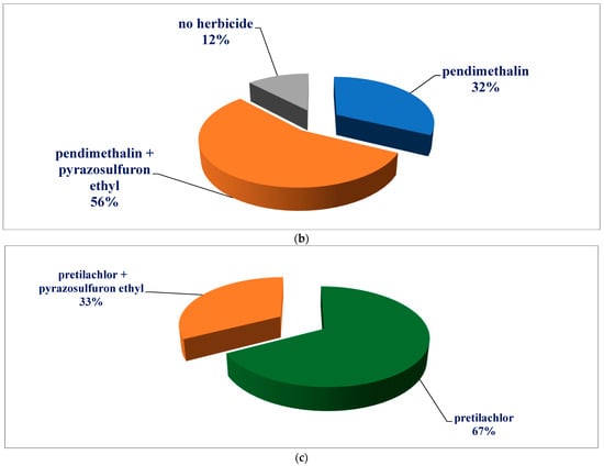 Pre-emergence herbicide used (in % area) under different methods of rice establishment. (a) DSR-PSI method of rice establishment. (b) DSR-IAS method of rice establishment. (c) PTR method of rice establishment.