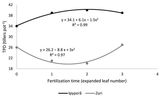 For Zuri grass, the timing of foliar fertilization also changed the TPD when there was low nitrogen dose fertilization in the soil (Figure 2). While the greater number of leaves favored the tillering of Ipypora grass, for Zuri grass, the greatest tillering occurred when foliar application occurred on 0 and 3 expanded leaves. In this case, the early application of foliar fertilizer, immediately after cutting, may have anticipated the assimilation of nitrogen, favoring the allocation of resources for the initial growth and formation of new leaves to the detriment of the emission of new tillers, which is a phenomenon observed in grasses managed under fractional fertilization [16,17,18]. However, these results need to be better studied, especially regarding the plant anatomy of the grasses studied, as well as identifying whether the assimilation of nutrients occurred through foliar or root means, as there are crops in which the greatest contribution of N to regrowth comes from the roots [19].