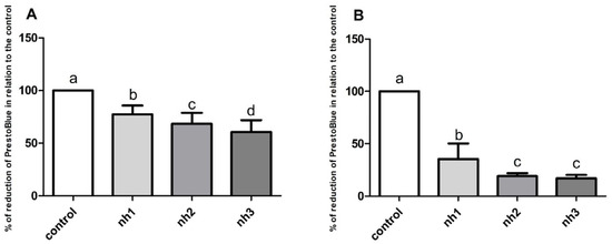 Cytotoxicity analysis: Percentage of reduction of Presto Blue™ in relation to the control after exposure of the HaCaT cell line to the natural herbicide (nh) for periods of 24 h (A) and 72 h (B). Data are displayed as mean ± standard error of the mean. The p-value considered significant was p < 0.05; groups with the same letters do not differ statistically, and groups with different letters present a statistically significant difference. ANOVA, Tukey’s post-hoc. n = 18.