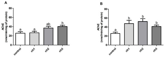 Analysis of acetylcholinesterase activity (AChE) on SH-SY5Y cells exposed to natural herbicide (nh) for 24 h (A) and 72 h (B). The results are expressed as mean ± standard error of the mean. The p-value considered significant was p < 0.05; groups with the same letters do not differ statistically, and groups with different letters present a statistically significant difference. ANOVA, Tukey’s post-hoc. n = 12.