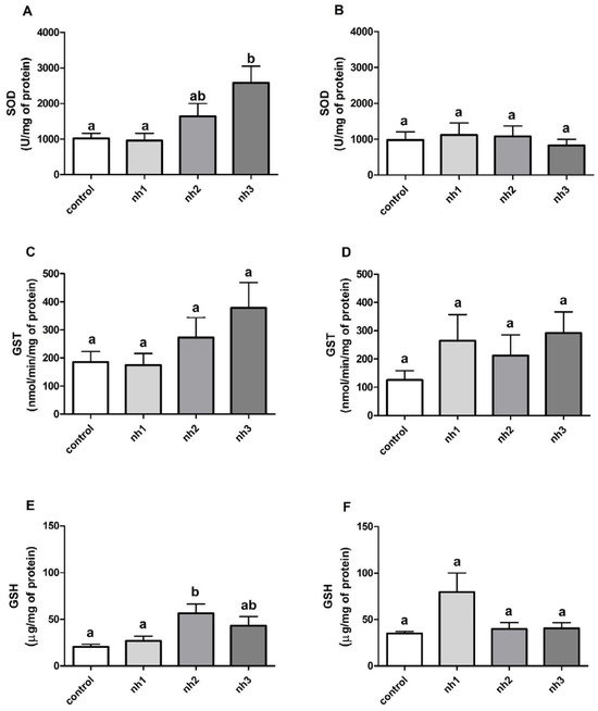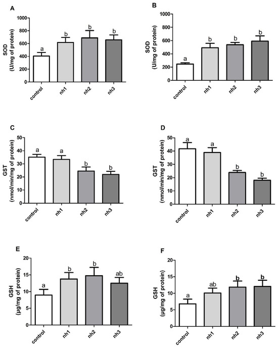 Analysis of the antioxidant system and SH-SY5Y cells exposed to the natural herbicide (nh). SOD = superoxide dismutase (U/mg protein), 24 h (A) and 72 h (B); GST = glutathione S-transferase (nmol/min/mg protein), 24 h (C) and 72 h (D); and GSH = reduced glutathione (μg/mg protein), 24 h (E) and 72 h (F). Results are expressed as mean ± standard error of the mean. The p-value considered significant was p < 0.05; groups with the same letters do not differ statistically, and groups with different letters present a statistically significant difference. ANOVA, Tukey’s post-hoc. n = 12.