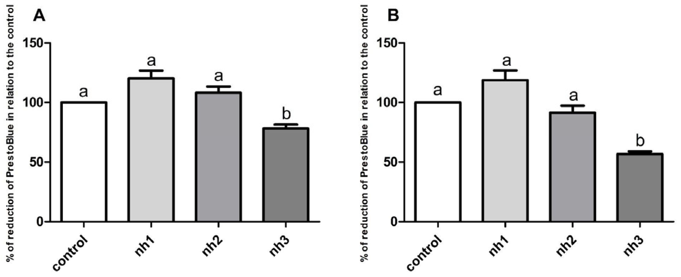 Figure 2. Cytotoxicity analysis: Percentage of reduction of Presto Blue™ in relation to the control after exposure of the HaCaT cell line to the natural herbicide (nh) for periods of 24 h (A) and 72 h (B). Data are displayed as mean ± standard error of the mean. The p-value considered significant was p < 0.05; groups with the same letters do not differ statistically, and groups with different letters present a statistically significant difference. ANOVA, Tukey’s post-hoc. n = 18.