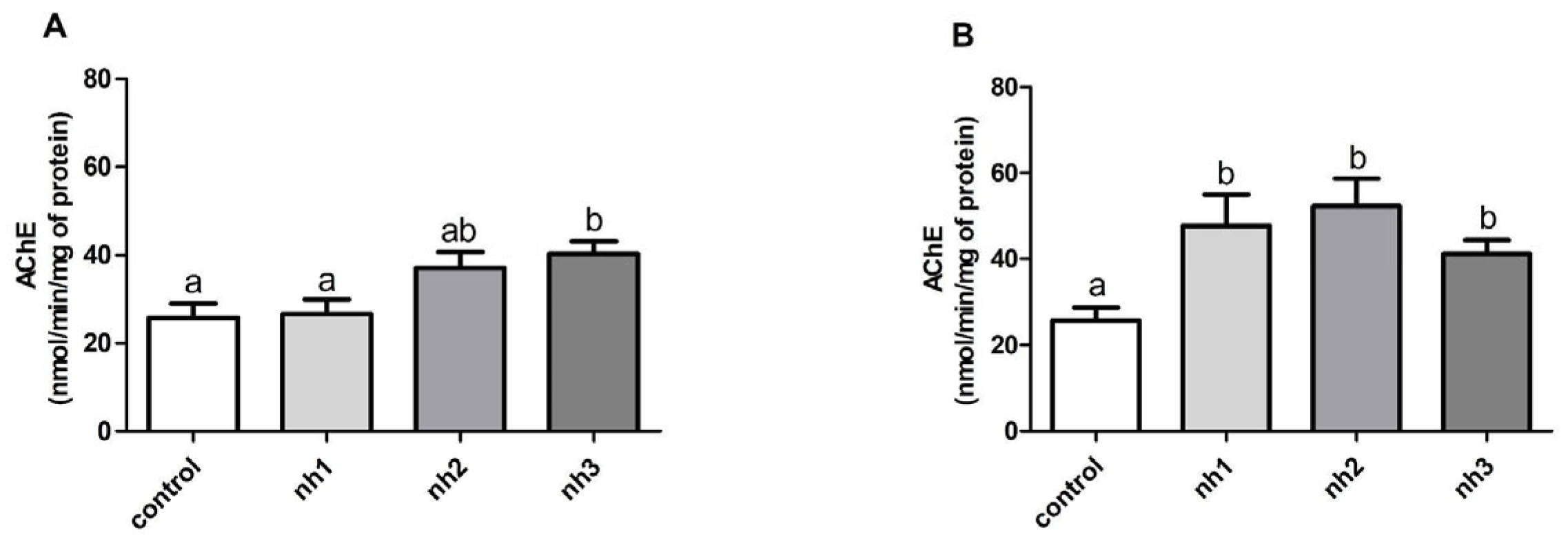 Figure 3. Analysis of acetylcholinesterase activity (AChE) on SH-SY5Y cells exposed to natural herbicide (nh) for 24 h (A) and 72 h (B). The results are expressed as mean ± standard error of the mean. The p-value considered significant was p < 0.05; groups with the same letters do not differ statistically, and groups with different letters present a statistically significant difference. ANOVA, Tukey’s post-hoc. n = 12.