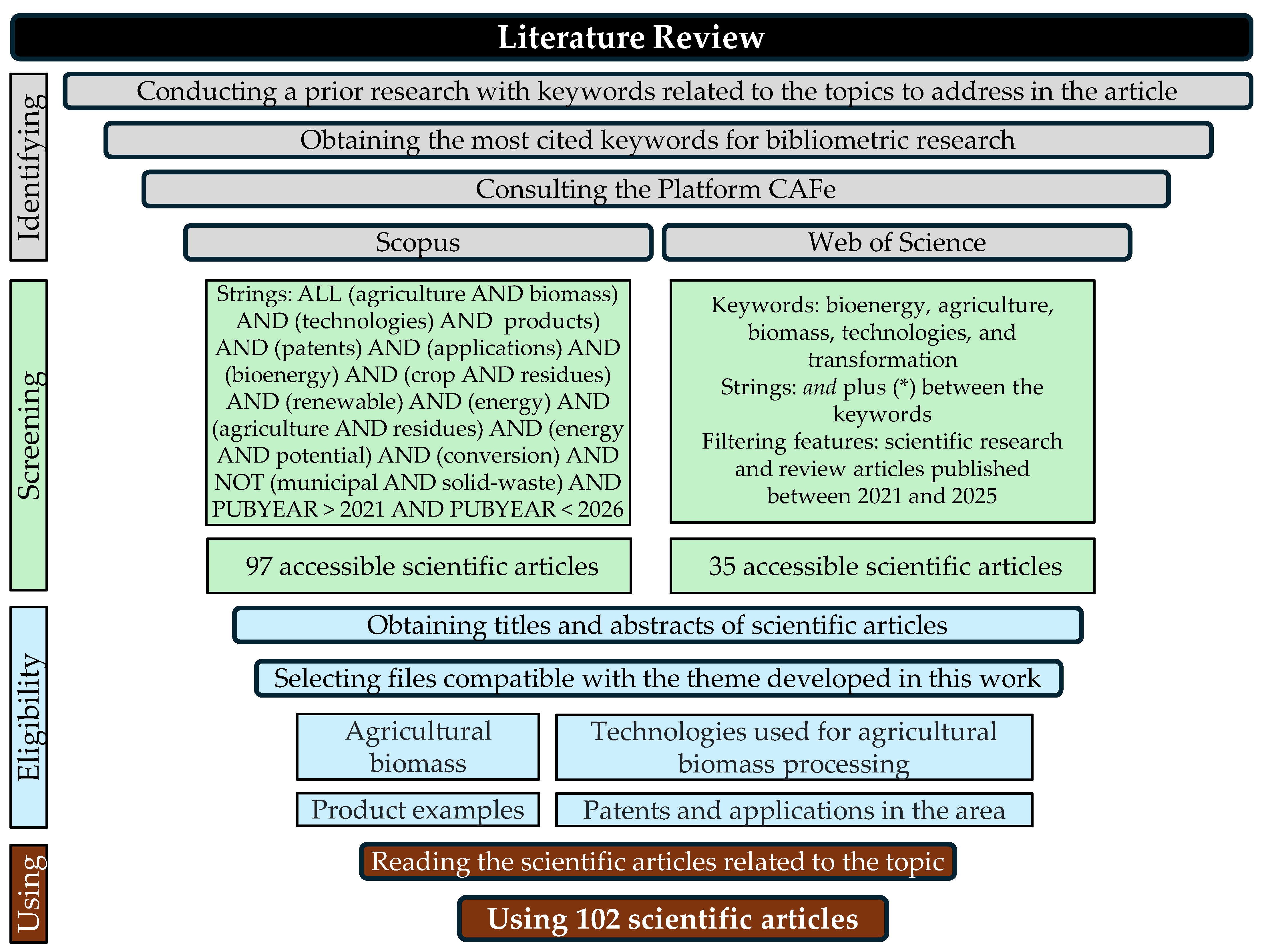 In alignment with the analytical goals of this review, a preliminary search was conducted to identify the most relevant keywords associated with the target themes, thereby optimizing the search process. The main topics covered included (a) agricultural biomass; (b) technologies applied to agricultural biomass processing; (c) examples of derived products; and (d) patents and applications in the field. Non-agricultural biomass, non-original research, and works outside the defined timeframe were excluded. In June 2025, the search was conducted, as outlined in the research flowchart (