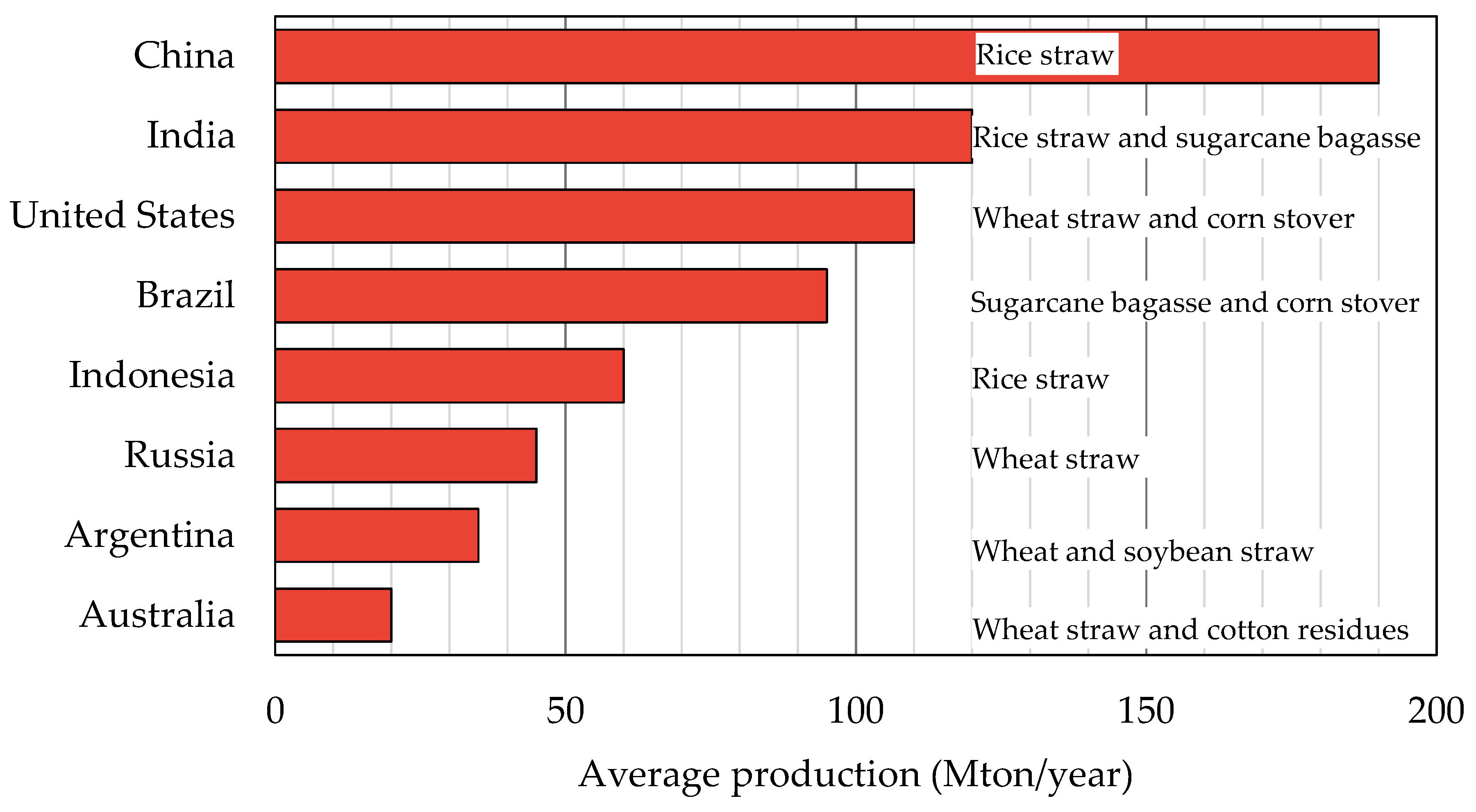 Considering this geographical availability, seasonality is a critical factor in the worldwide availability of some biomasses, as most biomass is generated during specific periods of the year, following harvest. This characteristic presents logistical challenges related to storage and transportation, as well as the preservation of biomass quality over time. Additionally, annual variations in agricultural productivity caused by climatic conditions, pests, and agricultural policies directly affect both the quantity and quality of the biomass produced. A graphical representation of the average yearly agricultural biomass production in selected countries is shown in