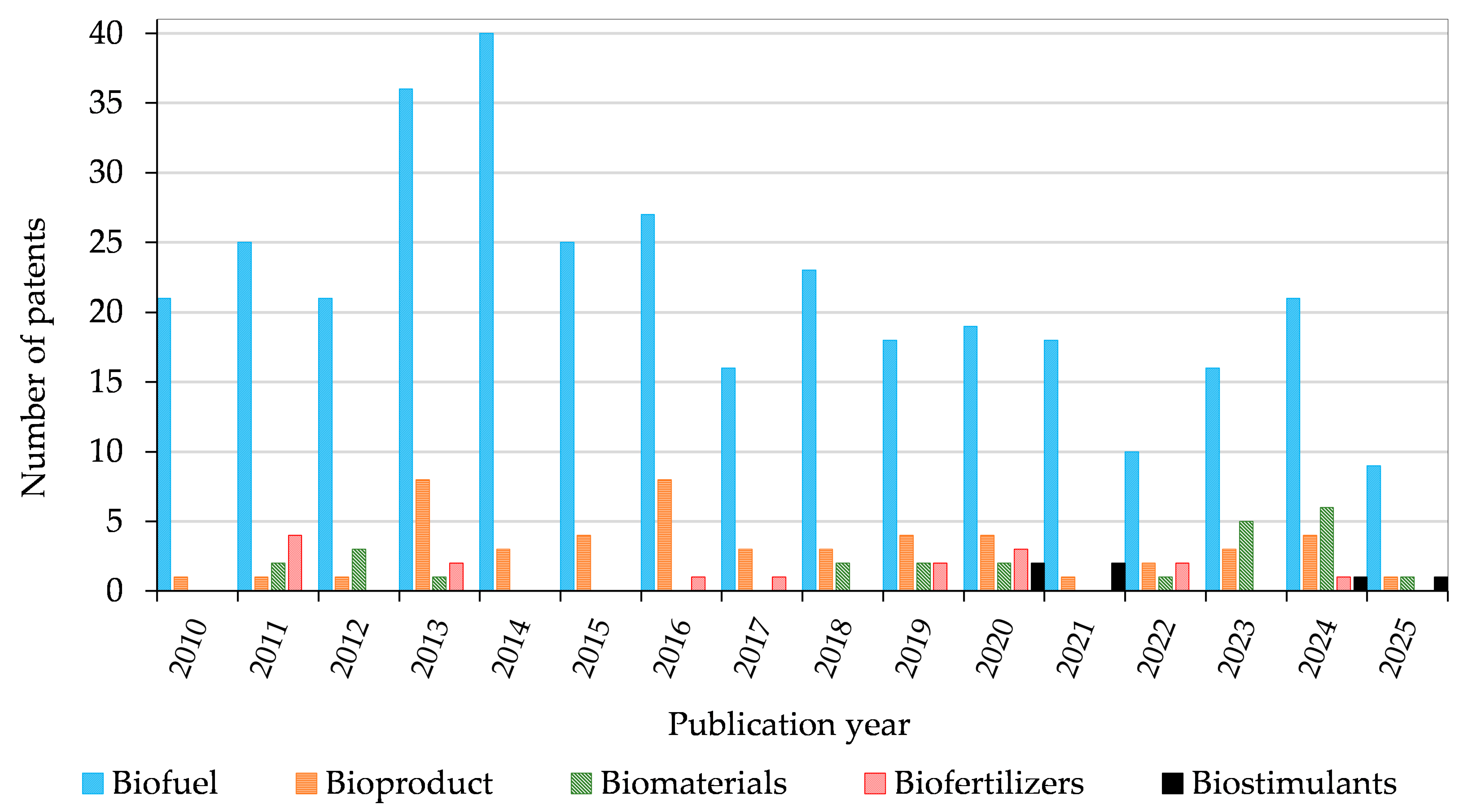 To further address gaps related to the focus of this study, a narrative review approach was employed for the sections “Patents and Applications” and “Agricultural Biomass”, using additional online platforms like Espacenet and Google Scholar. Some websites of agencies like USDA, FAO, IRRI, ABARES, UNICA, and CONAB were also consulted to obtain data on production. This method aimed to provide an overview of the agricultural and innovation landscape, including opportunities, challenges, and technological potential for biomass conversion into biomaterials, biofertilizers, and bioproducts, as well as the number of patents in the field.
