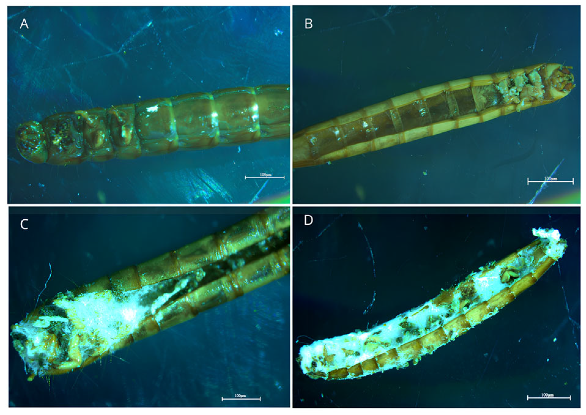 - Vega, F.E.; Goettel, M.S.; Blackwell, M.; Chandler, D.; Jackson, M.A.; Keller, S.; Koike, M.; Maniania, N.K.; Monzón, A.; Ownley, B.H.; et al. Fungal entomopathogens: New insights on their ecology. Fungal Ecol. 2009, 2, 149–159. [Google Scholar] [CrossRef]