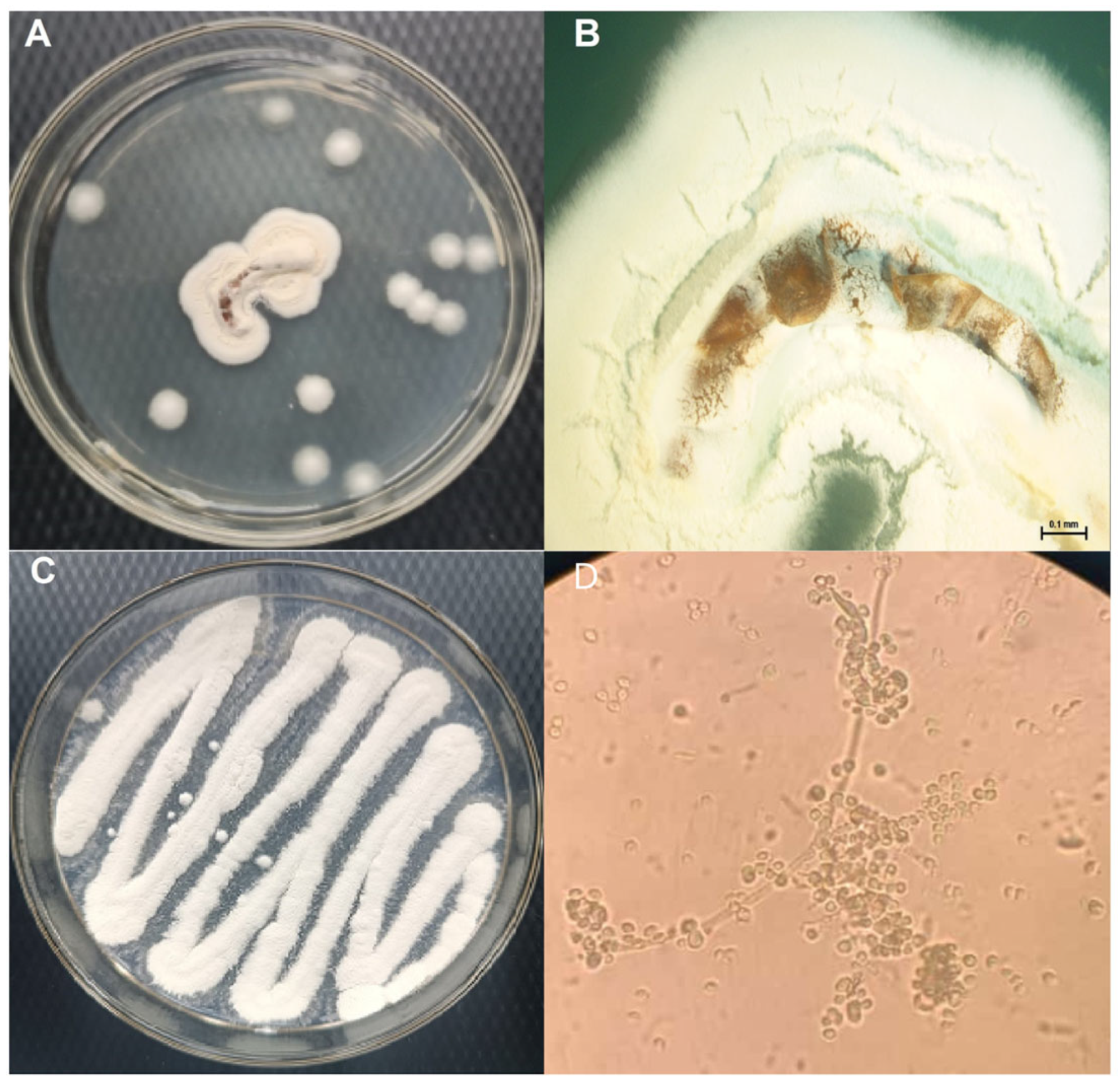 - Wang, Y.; Fan, Q.; Wang, D.; Zou, W.-Q.; Tang, D.-X.; Hongthong, P.; Yu, H. Species diversity and virulence potential of the Beauveria bassiana complex and Beauveria scarabaeidicola complex. Front. Microbiol. 2022, 13, 841604. [Google Scholar] [CrossRef] [PubMed]