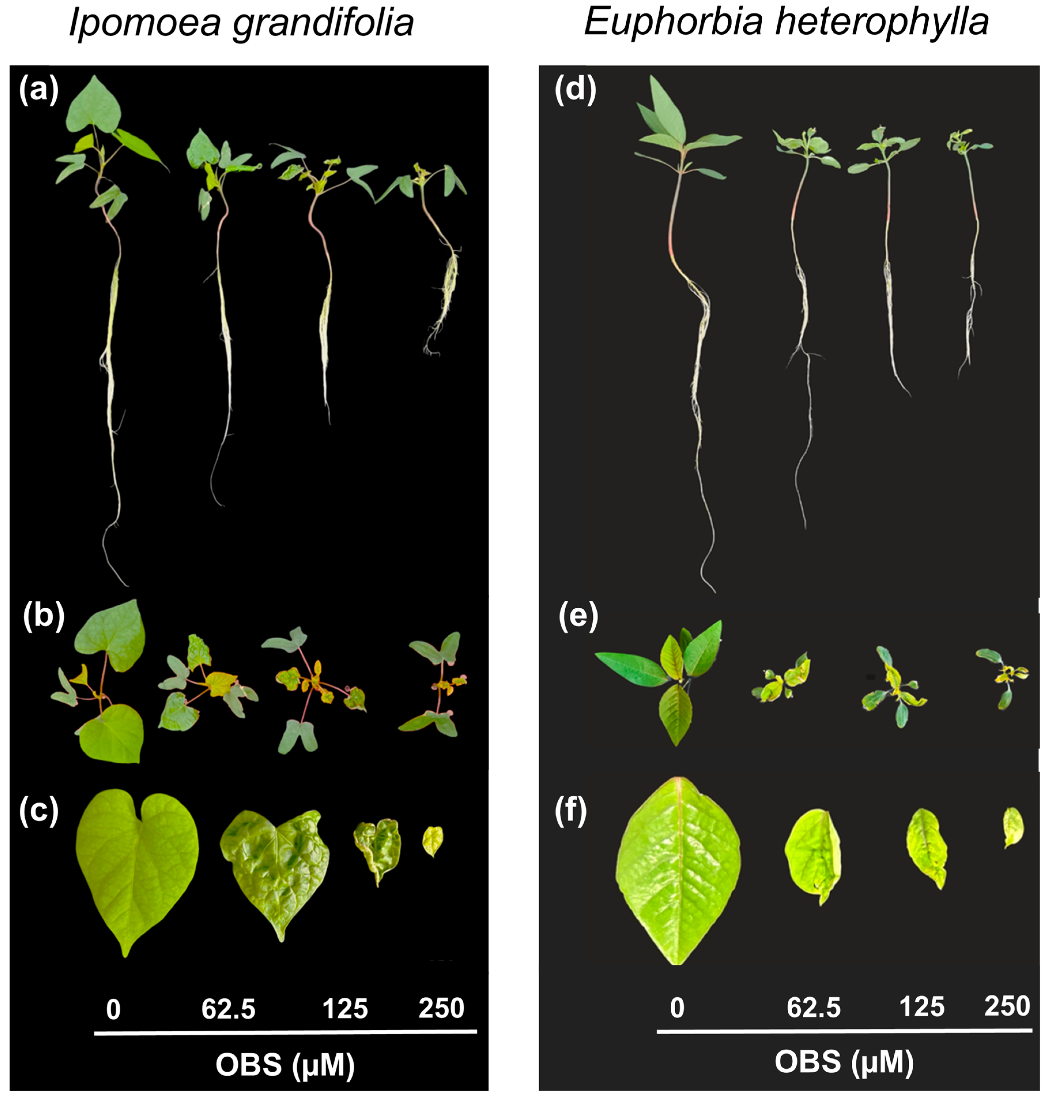 3.2. Effects of OBS on the Growth of Ipomoea grandifolia and Euphorbia heterophylla