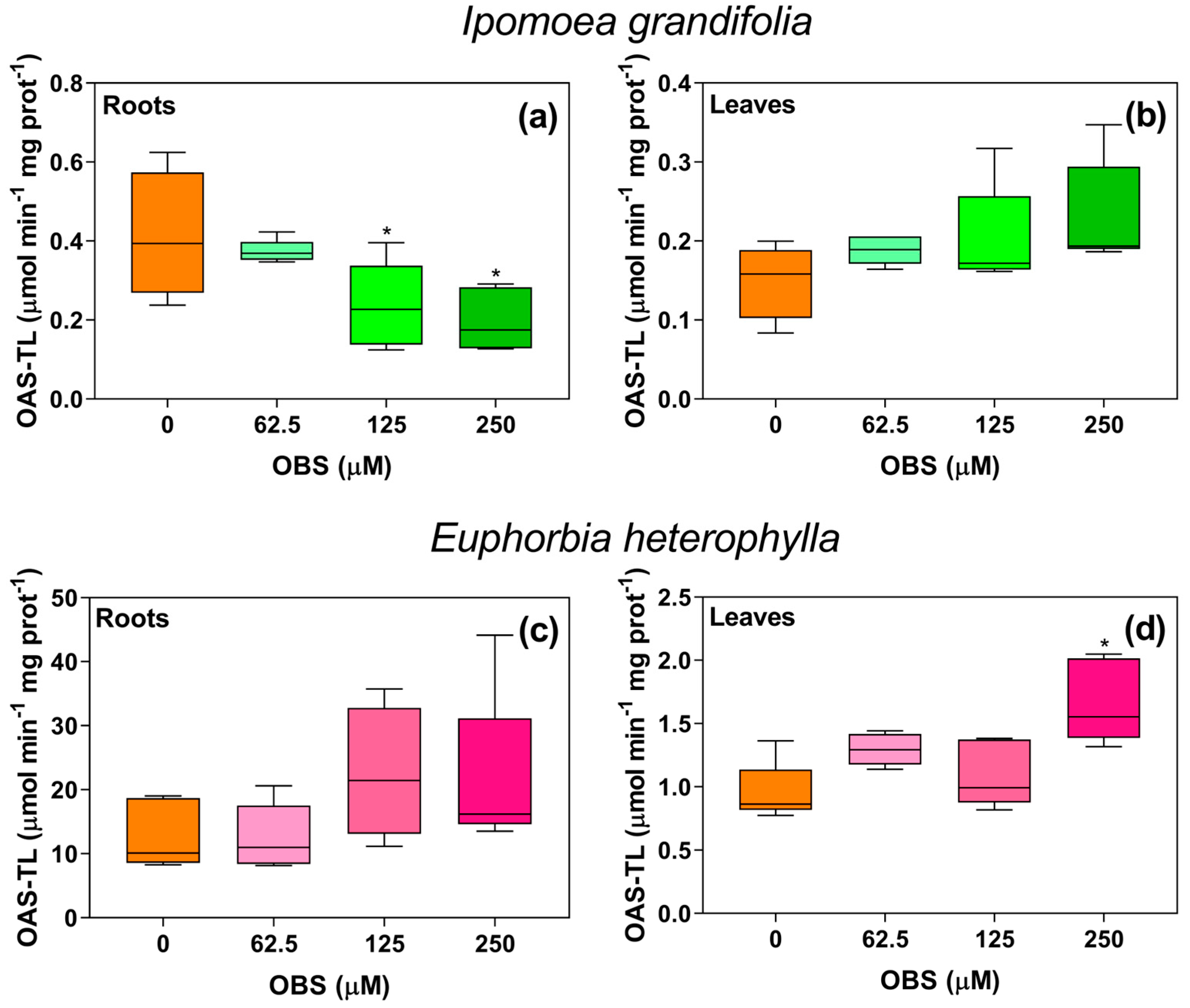 3.3. Effects of the OBS on the Activities of OAS-TL of I. grandifolia and E. heterophylla Plants