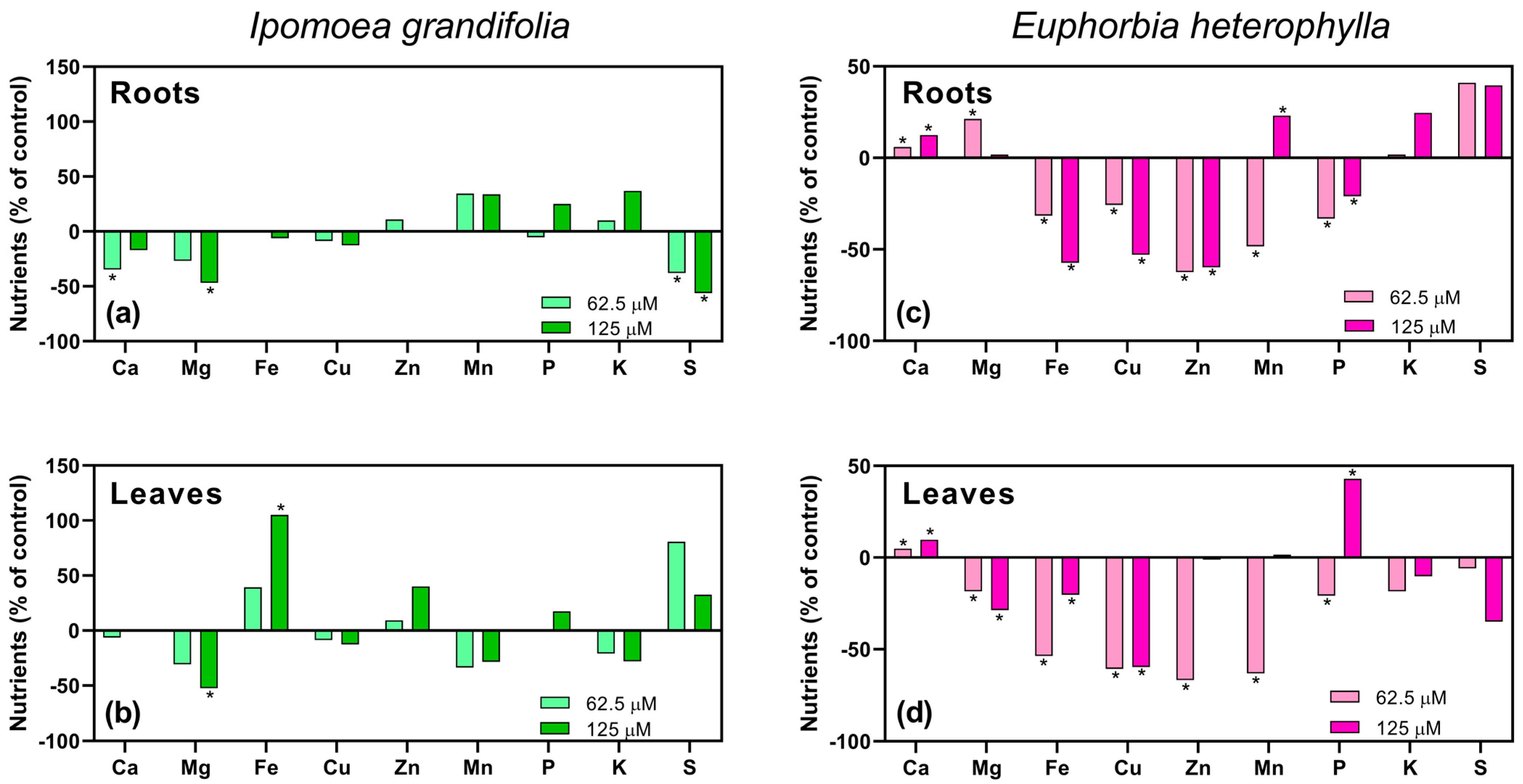 3.4. Effects of OBS on Nutrient Content in the Roots and Leaves of I. grandifolia and E. heterophylla