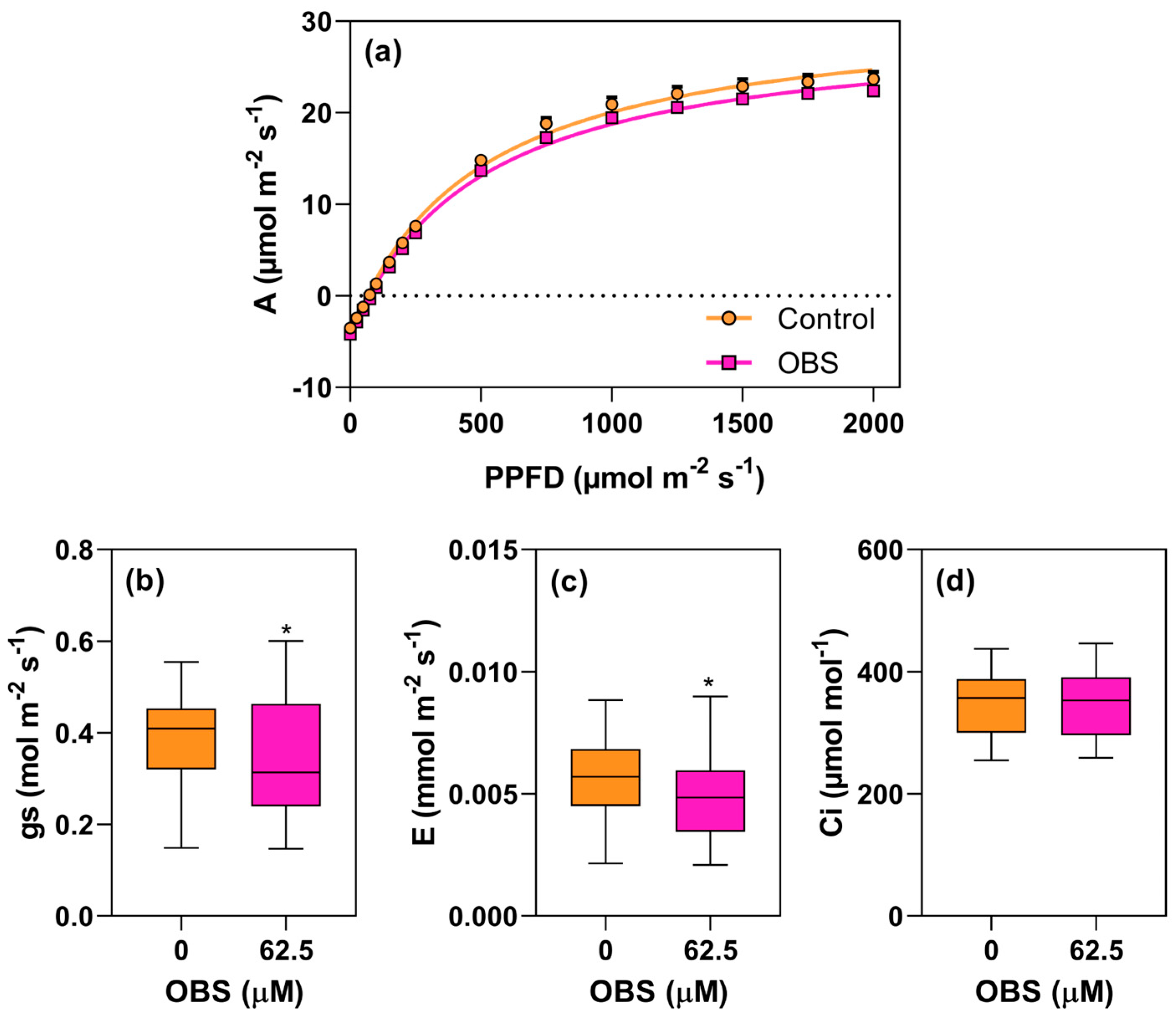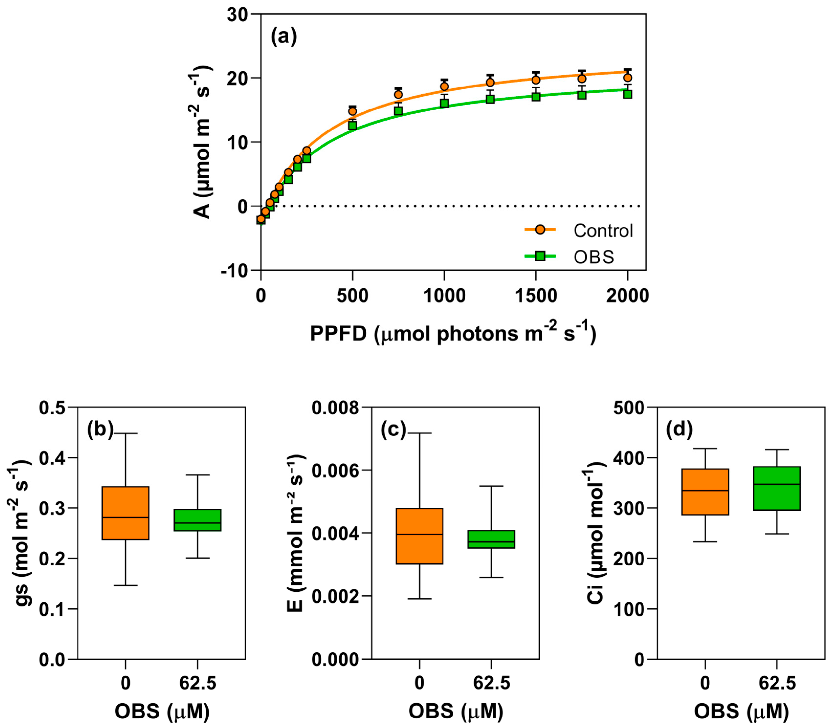 3.5. Effects of OBS on Photosynthetic Performance of I. grandifolia and E. heterophylla