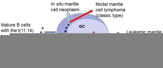 In situ mantle cell neoplasia (or in situ mantle cell neoplasm) (ISMCN) is an earlier form of the disease that may precede, coexist with, or occur after the development of an overt MCL (reviewed in [106]). The relationships between in situ mantle cell neoplasia and the two overt forms of MCL are depicted in Figure 1 (figure previously published in open access publication [106]). The genetic hallmark of MCL is the t(11;14)(q13;q32) translocation, which leads to CCND1 juxtaposed with the IGH locus, causing overexpression of cyclin D1, a cell cycle regulator. Rare cyclin D1-negative MCL cases may harbor CCND2 or CCND3 gene rearrangements.