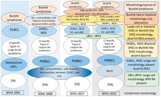 In 1994, the REAL classification introduced grading of FL into grades 1, 2, 3A, and 3B [90] based on criteria proposed in 1983 for counting centroblasts in ten high-power microscopic fields [91]. The WHO 2001 classification divided grade 3 FL into grades 3A (centrocytes present) and 3B (centrocytes absent) [92]. The REAL classification was based on the Kiel classification, compared in [93] (Table 3A, pp. 325–326). Still, the introduction of FL grading by the REAL and WHO classifications was in contrast with the Kiel classification due to the following reasons cited by the Kiel group: “unclear clinical relevance and lack of reproducibility of stratification based on the numbers of blasts in the neoplastic follicles, including about 50% reproducibility among different experienced hematopathologists for this grading system” [94] (p. 12). As stated in the cited reference, the Kiel group believed that “in our opinion, it is of major importance to distinguish between diffusely distributed blasts and solid sheets. The latter (corresponding to grade 3b) indicates a transformation into a diffuse large B-cell lymphoma, which should be noted in the report” [94] (p. 12). In WHO 2008, FL grades 1 and 2 were merged as low grade (0–15 centroblasts per high-power microscopic field), and grade 3A needed to be distinguished from grade 3B. This grading system continued in the revised fourth edition in 2017 but is no longer mandatory and considered optional in WHO-HAEM5 for similar and continued reasons cited earlier, including lack of reproducibility due to technical reasons, inter-observer variability in counting centroblasts, and differences in sizes of high-power microscopic fields [11,95,96]. Challenges in FL grading were noted to be present in the SWOG study that showed a 10-year overall survival of 79% for FL grades 1/2 compared to 68% for FL grade 3A (p = 0.0990) [97]. In contrast with WHO-HAEM5, the ICC has continued to recommend grading to study further in the context of current clinical therapies [13].