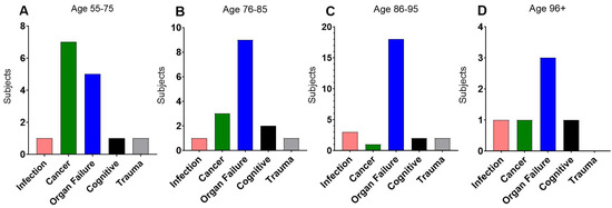 Almost half of the subjects in the young-old age group passed due to some form of cancer, making it the most common cause of death in this age group (Figure 1). Deaths related to cancer in the older age groups steadily declined with increasing age. Only one subject in the old-old and outliers age group passed away from cancer. Organ failure was the leading cause of death for the oldest three age groups, with 50% or more of the subjects having this COD on the death certificate (Figure 1B–D). These findings are consistent with the data from the CDC, wherein 2020, the most common cause of death in people aged 55–64 was malignant neoplasm, and in the 65+ y/o subjects, it was heart disease [36]. Infection impacted the young-old, middle-old, and outliers’ groups almost equally, with one subject each assigned to this COD category. Three subjects died of infection in the old-old age group (Figure 1). Deaths related to cognitive decline were well dispersed between age groups, with 1–2 subjects in each age group passing from Alzheimer’s disease. There was one death related to trauma in each of the youngest age groups and no deaths related to trauma in the outliers group.