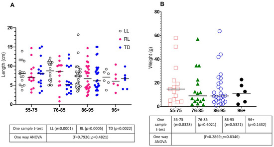 Data in Table 2 show a one-sample t-test summarizing how the means of thymic measurements in the KYCOM cohort separated by sex differ from males or females from a human population encompassing a broader age span. In the analysis shown in Figure 2, we asked whether a person’s age, regardless of sex, could influence the length of the LL, RL, TD, and thymic weight. Applying a one-sample t-test, we examined whether the means of the thymic parameters in the KYCOM cohort were different from the hypothetical means of a general population, including both males and females. We found that all thymic size (Figure 2A) but not weight (Figure 2B) parameters were significantly different in our cohort, regardless of the person’s age at the time of death. Then, applying a one-way ANOVA, we looked at thymic size measurements in the KYCOM cohort alone and asked whether thymic measurements in all age groups were statistically equal and whether at least one age group was different. This analysis showed no significant difference in the means of thymic size or weight measurements between the age groups in the combined male and female population of the KYCOM cohort (Figure 2A,B). Thus, we concluded that the thymic anatomy does not vary significantly in different age groups in the elderly population.