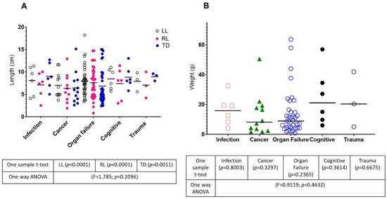 The results of one sample t-test (Table 2) showed that, in several measured parameters, the size of the thymic gland in elderly males and females was statistically different than in cohorts including the younger subjects. So, we asked whether thymic size variations in the KYCOM cohort may be associated with the COD and applied a two-fold analysis of a one-sample t-test and one-way ANOVA. Similarly, as for the analysis shown in Figure 2, the results of one sample t-test showed that the differences between the means for the thymic size (Figure 3A), but not weight (Figure 3B) measurements, were also significant in each COD category, suggesting that thymus aging may follow a particular pattern. For example, in all COD groups, the mean size of the LL was larger than that of the RL, which suggests that the LL is infiltrated by the adipose tissue sooner than the RL (Figure 3A). This asymmetrical involution of the thymus may lead to the prolonged preservation of the structure and function in the right thymic lobe as we reported before [16]. The thymi in subjects who died from infection, cognitive, or traumatic causes had the highest mean values for the TD, while in cancer and organ failure groups, the TD mean values were the lowest.