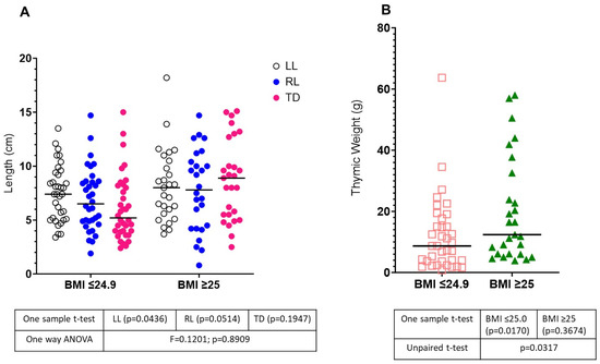 The associations between thymic parameters and the BMI. A one-sample t-test was used to test how the means of the thymic parameters in the KYCOM cohort (males and females) arranged according to the BMI are different from hypothetical means derived from the general population (males and females). (A) One-way ANOVA was used to test the total variability among categorical characteristics such as left and right lobes’ lengths, transverse diameter, and variations between two BMI groups. We tested the ANOVA hypotheses: (1) Ho—all BMI group means in the KYCOM cohort were statistically equal, and (2) Ha—at least one BMI group in the KYCOM cohort was different. (B) An unpaired t-test was used to compare the means of thymic weight in two BMI groups. Symbols