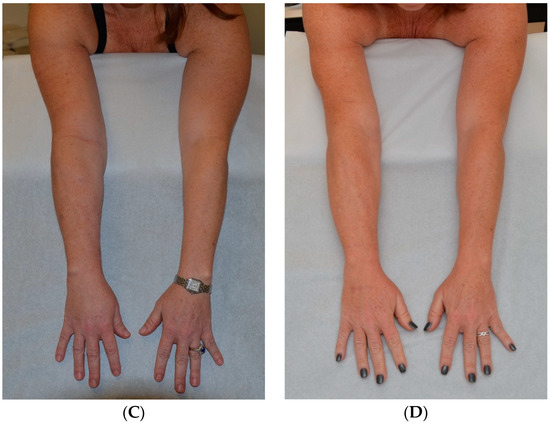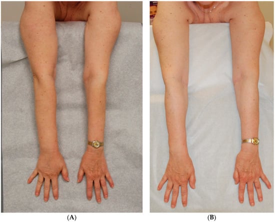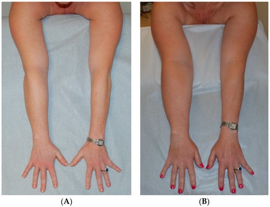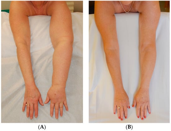 (A) Before Surgery: Lymphedema of the left arm following treatment for breast cancer; (B) After SAPL and subsequent staged VLNT surgery: excess volume reduction of approx. 105% (affected arms slightly smaller than opposite side) and no garment required approx. 8–12 h each day [14]. Reproduced with permission from [14], published by Springer Nature B.V., 2022.