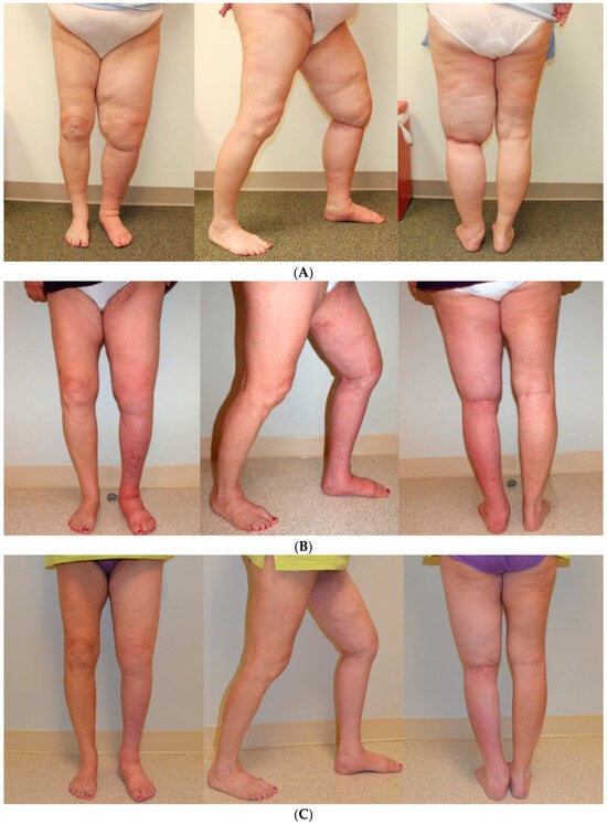Patient with a 46-year history of congenital lymphedema of the left leg prior to the SAPL procedure. The scar from her previous excisional operation, attempted elsewhere, is visible on the medial aspect of her left leg. An overall volume reduction of over 5000 cc was achieved with significant improvement in mobility of the knee joint. The excess loose skin present after surgery contracted completely, as typically occurs with the SAPL procedure. Since the procedure, she has had no further episodes of cellulitis [75]. (A) Before SAPL Surgery. (B) Nine months following SAPL. (C) Twenty-one months following SAPL. Reproduced with permission from [75], published by the International Society of Lymphology and the University of Arizona Libraries, 2017.