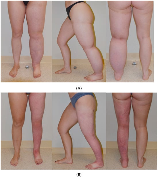 Patient with a history of congenital lymphedema of the left leg for 17 years. Patient maintains a stable reduction in excess volume of 123% (affected left leg smaller than right leg) following SAPL surgery [38]. (A) Patient before SAPL surgery; (B) Patient 10 months after surgery. Reproduced with permission from [38], published by Thieme, 2018.