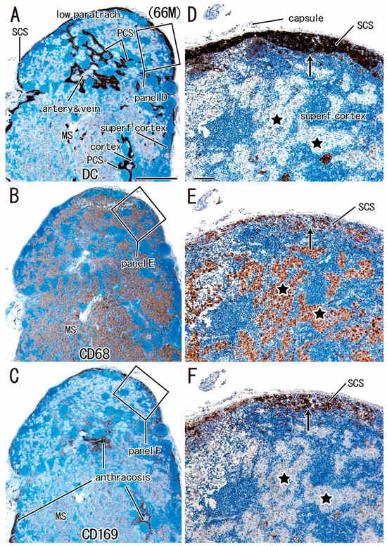 For simplification, DC-SIGN-positive cells are called “candidate DCs”. In all nodes examined, the medullary sinus was filled with CD68-positive macrophages containing carbon particles (i.e., anthracotic macrophages), whereas candidate DCs and CD169-positive cells were usually localized in the subcapsular, intermediate, and paracortical sinuses, as well as along arteries and veins (Figure 1, Figure 2 and Figure 3). Outside of the medullary sinus, CD68-positive macrophages tended to contain no or few carbon particles (Figure 1E, Figure 2E and Figure 3E). The complementary distribution tended to be more clearly observed in the paratracheal and subcarinal nodes (Figure 2D–F and Figure 3D–F) relative to the hilar node (Figure 1D–F). Thus, candidate DCs and CD169-positive cells usually coexisted (Figure 2D vs. Figure 2F; Figure 3D vs. Figure 3F), whereas almost all medullary sinus macrophages were CD68-positive and CD169-negative (Figure 1E vs. Figure 1F). The medullary sinus issued protrusions toward the cortex to divide the latter (Figure 2E). The paracortical sinus surrounded one follicle and connected it to another follicle (Figure 3A,D). The intermediate sinus was situated along the trabeculae that originated from the nodal capsule and was inserted into and divided into the superficial cortex (Figure 1D). Overall, the hilar nodes tended to contain fewer CD169-positive cells than the paratracheal and subcarinal nodes. Although we did not perform double staining, CD169-positive and CD68-negative cells were likely present (Figure 3F vs. Figure 3E).