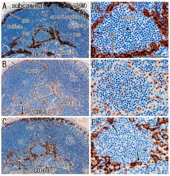 Subcarinal node in a male patient with lower lobe cancer (age: 76 years). Three sections located within close proximity to each other. Panels (A,D): immunostaining of DC-SIGN; panels (B,E): immunostaining of CD68; panels (C,F): immunostaining of CD169. Panels (D–F) display higher-magnification views of the squares in panels (A–C), respectively. The superficial cortex (superf. cortex) was thick and contained follicles (panel A). Candidate DCs were seen in the subcapsular sinus (SCS in panel A) and paracortical sinus (PCS in panels A and D). CD68-positive cells were observed around the follicle (panel E), as well as in the medullary sinus (MS; arrow in panel B). CD169-positive cells exhibited a distribution similar to that of candidate DCs (panel F vs. panel D). Most of the medullary sinus macrophages were CD169 negative (MS; arrow in panel C). CD169-positive cells indicated by arrows in panel (F) are likely to be CD68-negative. Panels (A–C) (or panels D–F) were prepared at the same magnification (scale bars: 0.1 mm in panels A and D).