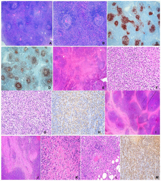 KFD was described in 1972 independently by Kikuchi [26] and Fujimoto [27]. The greatest dimension of the involved lymph node could be large and up to 7cm [28]. Rarely, extranodal involvement of skin, liver, spleen, central nervous system, kidney, and heart has been reported [28]. KFD affects mostly Asians with female predominance, though non-Asians are also affected [29,30,31]. Patients present with fever, leukopenia, with self-limiting disease duration of up to 6 months. Recurrence may occur up to 2 years after the initial presentation [28,32]. The involved lymph nodes characteristically show cortical and paracortical variably sized discrete or confluent pale nodular areas constituted by many histiocytes, which are phagocytic or non-phagocytic with special morphologic types including crescentic histiocytes, signet ring histiocytes, and plasmacytoid dendritic cells (pDC). There are admixed variable quantities of immunoblasts, karyorrhectic and eosinophilic debris, and sometimes coagulative necrosis and focal fibrovascular organization. Neutrophils are conspicuously absent or very rare (Figure 1E–H). Kuo [28] recognized three histologic patterns, proliferative, necrotizing, and xanthomatous, which are not patterns of temporal progression but histologic variations related to individual host immune response. Immunohistochemically, the histiocytic cells are CD163+, CD68+, CD4+, and myeloperoxidase+. The T-cells are mostly CD8+, and with rarely CD4+ T-cells. The pDC are positive for CD123, CD4, and CD68. CD20+ B-cells are practically absent. DNA ploidy shows diploidy, supporting a reactive nature [28]. KFD is classified under “tumour-like lesion with T-cell predominance” in the fifth edition of the WHO Classification of Haematolymphoid Tumours, which is in line with the important role of exuberant T-cell-mediated response in the disease [7].