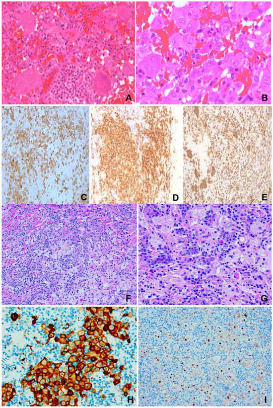 There is extensive lymph nodal sinusoidal expansion or effacement of nodal architecture (advanced cases) by histiocytes with hyperchromatic nuclei, distinct nucleoli, pale crispy cytoplasm characteristically featuring hematolymphoid cells within vacuoles; a feature known as emperipolesis (Figure 2F–I). The cortex comprises B-cells, plasma cells, and some follicles, which, with the pale histiocytic cells, constitute an alternating dark and light zonal appearance. Many IgG4-positive plasma cells may be present, which may be confused with IgG4RD [42]. Marked fibrosis, sometimes storiform, may occur. Extranodal disease is similar, usually with more lymphoid follicles and less emperipolesis. There may be co-existing lymphoma, LCH, and ECD. The histiocytic cells are S-100+, CD68+, CD163+, CD1a−, and CD207 [7,65].