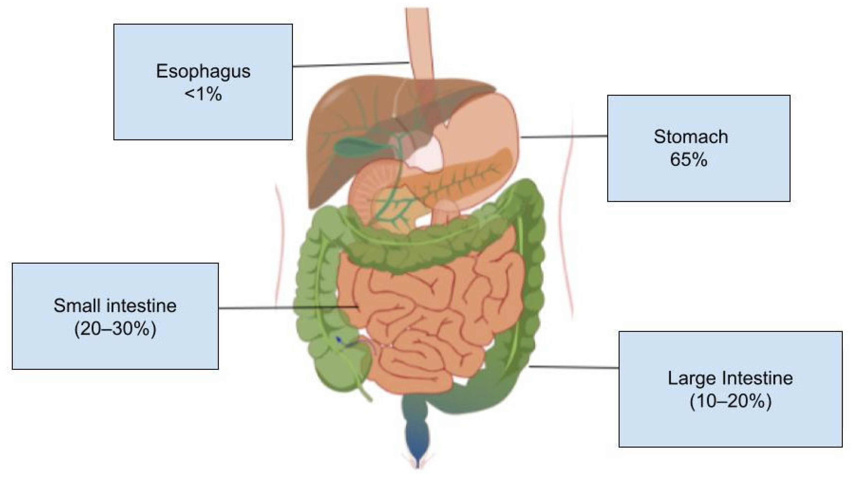 - Ge, Z.; Liu, Z.; Hu, X. Anatomic distribution, clinical features, and survival data of 87 cases primary gastrointestinal lymphoma. World J. Surg. Oncol. 2016, 14, 85. [Google Scholar] [CrossRef] [PubMed]