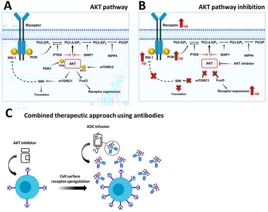 Inhibitory and feedback mechanisms of the PI3K/AKT/mTOR signaling pathway. (A) AKT and mTOR are two important proteins that serve as hubs in the regulation of PI3K/AKT/mTOR signaling. mTOR regulates translation via S6 kinase and adaptor proteins such as IRS-1. AKT regulates receptor expression through transcription factors such as FOXO. (B) AKT inhibition leads to the loss of negative feedback in the pathway and thus to increased receptor expression. It also leads to the inhibition of mTOR. mTOR inhibition leads to the stabilization of IRS-1 and thus to increased receptor and PI3K activation. (C) Schematic representation of the combined therapeutic approach consisting of an AKT inhibitor that upregulates receptor expression on the cell surface and an antibody–drug conjugate that binds to the upregulated receptor and specifically transports the conjugated cytotoxin into the cell by subsequent endocytosis.
