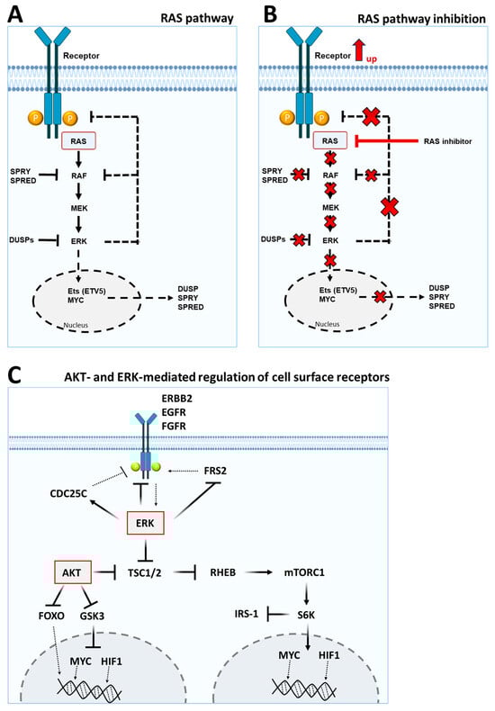 Inhibitory and feedback mechanisms of the RAS/MAPK signaling pathway. (A) Receptor tyrosine kinases (RTKs) at the plasma membrane are activated by extracellular ligands. Binding of the ligand to the receptor facilitates the activation of the tyrosine kinase activity of the cytoplasmic domain of the receptor. The tyrosine phosphorylated receptor serves as docking site for the SH2-domain containing GRB2 adapter protein. SOS, in turn, can bind to GRB2 and becomes activated. Activated SOS, via its GEF activity, promotes the exchange of GDP for GTP from a member of the RAS subfamily. GTP bound and active RAS then activates RAF kinases. RAF kinases phosphorylate and activate MEK kinases. MEK kinases phosphorylate and activate ERK kinases. ERK kinases can translocate into the nucleus of the cell and can activate different transcription factors, which among others, upregulates its own negative regulators of the DUSP, SPRY and SPRED family. High ERK activity leads to feedback mechanism and in consequence to reduced expression and/or lower activity of the initiating RTK through various mechanisms. (B) RAS/MAPK pathway inhibition leads to the loss of negative feedback in the pathway and thus to increased receptor expression, which in turn can again activate the mitogen-activated protein kinase pathway. (C) AKT- and ERK-mediated regulation of cell surface receptors. AKT and ERK control cellular transcription and activation of cell surface receptors, in part, through MYC, HIF1 and FOXO. AKT and ERK phosphorylate and inhibit TSC1/2 thus activating mTORC1 by relieving inhibition of RHEB. The S6K is a downstream target of mTORC1 and can activate MYC and HIF1 or inhibit the receptor adaptor protein IRS-1. AKT can also inhibit FOXO, MYC and HIF1, partly by inhibiting GSK3. GSK3-mediated phosphorylation of MYC and HIF1 targets their proteasomal degradation. ERK can also influence the expression and activation of receptors directly by phosphorylation or by phosphorylation of mediators such as CDC25C and FRS2.