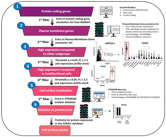 The exponential growth of large transcriptome data opens a new dimension in molecular biology by analyzing the entire spectrum of RNA transcripts in a cell. Large transcriptome datasets from ALL samples from major studies [94,95,96] provide important information and have led to groundbreaking discoveries. To explore novel cell surface targets from publicly available transcriptome datasets of ALL patient samples, we first selected protein-coding genes using Ensembl BioMart (Ensembl release 115; EMBL-EBI, Hinxton, UK). In the next step, we selected plasma membrane genes using an annotation list consisting of datasets from “the in silico human surfaceome” database, the Human Protein Atlas (HPA; subcellular location: selected for plasma membrane and cell junctions), the Gene Ontology database (GO:0009986; cell surface) and an “immune inhibitory receptor” dataset by Sing and colleagues (Figure 3) [97,98,99,100,101,102].