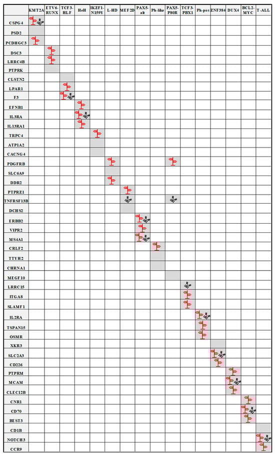 The absence of targetable antigens on hematopoietic stem cells offers an advantage, as normal blood cells can be replenished from hematopoietic stem cells after transient ADC-induced depletion. Genes were carefully reviewed for their location on the outer cell membrane for their accessibility to immunotherapeutics using the STRING database analysis function and manual analysis of different datasets (UniProt keywords: KW-0472/membrane; UniProt keywords: KW-1133/transmembrane helix; Gene Ontology—cellular component: GO:0005886/plasma membrane; Gene Ontology—cellular component: GO:0071944/cell periphery; Gene Ontology—cellular component: GO:0016021/integral component of membrane and HPA—predicted location) [103] (Table S2) as well as prioritized based on their protein expression using immunohistochemical (IHC) data [104] (Table S3). The three most promising candidates for each B-ALL subgroup and T-ALL cells were listed (Table 1).