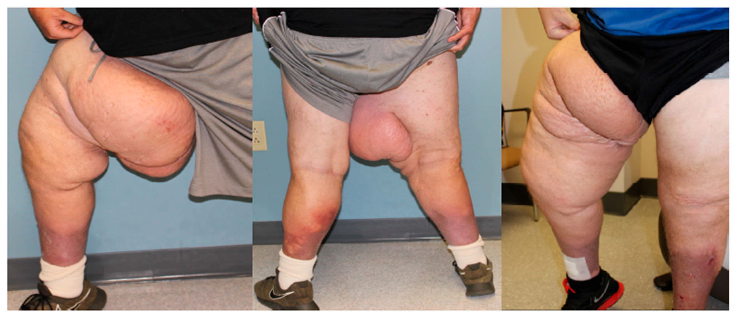 - ElKiran, Y.M.; ElShafei, A.; Morshed, A.M.; Elkiran, Y.Y.; Elmetwally, A.M. Hybrid approach of massive lipolymphedema of the thigh: A novel surgical technique. J. Vasc. Surg. Venous Lymphat. Disord. 2024, 13, 101987. [Google Scholar] [CrossRef] [PubMed]