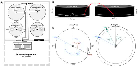 Our study used 18 adult female desert grassland scorpions (Paruroctonus utahensis), as females are known to be more loyal to their burrows than their male counterparts []. The scorpions were collected from a sandy area in the Chihuahuan Desert near Monahans, TX, USA. We used UV lights to find the animals at night during a period of the new Moon in early March 2022. The animals were maintained in 3.8 L glass jars with 100 mL of sand from their native habitat along with a 3 cm half PVC pipe for shelter. They were misted with water (approximately 2 mL) and fed one small cricket (Acheta domesticus) once a week. The jars were kept at a temperature of approximately 20 °C on shelves in a room inside the animal laboratory building on the University of Oklahoma campus. The room was windowless and set on a reverse day cycle, with the lights turning on at 20:00 and off at 06:00 to adjust the scorpions’ normal nighttime activity period to times convenient for the researchers. The animals were maintained under the altered light regime for at least a week before testing began.