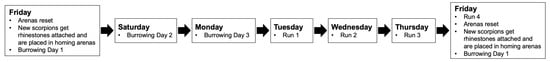 Weekly testing schedule. On Fridays, the homing arenas were reset by removing the mounds and thoroughly stirring the substrate sand. A fresh mound of sifted native sand was sprayed with 15 mL of water over a partially exposed pizza saver. Additionally, rhinestones were attached to the scorpions, and the scorpions were placed in the homing arena and allowed to form burrows through Monday. If the scorpions burrowed by Tuesday, runs were conducted Tuesday through Friday. Runs were only conducted if the animals had emerged from their burrows and were found along the wall.