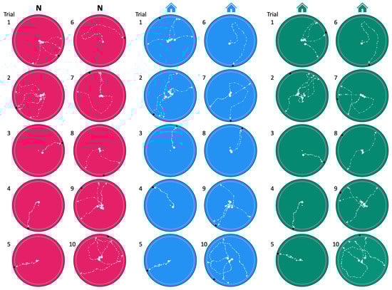 Path integration (PI) is the ability of an animal to integrate distance and direction while leaving its home to compute an approximate homebound vector [,]. PI has been documented in many animals, including, but not limited to ants [], bees [], some species of spiders [,,], and may be possible in whip spiders []. Historically, PI has been tested using displacement experiments. For example, desert ants displaced after discovering a feeding station ran in a relatively straight vector towards where their home would have been had they not been displaced [,]. Wolf spiders (Lycosa tarantula) coaxed from their homes in a rectangular arena and transferred to the center of a circular arena also moved along a vector that correlated with where their home would have been had they not been displaced [].