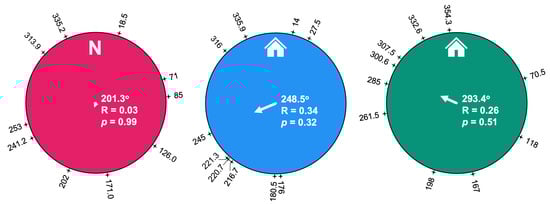 The resultant vectors for each trial were used to calculate the composite resultant vector for the three adjustment categories (Figure 5). The points on the perimeter of the circles in Figure 5 indicate the average circular angle at which the scorpion crossed the decision line for each trial, and the central arrows depict the overall composite vector based on Rayleigh’s calculation. The plots show wide scattering of the trial vectors and no statistically significant directionality for any of the adjustment categories (p > 0.05; Rayleigh’s Z test).