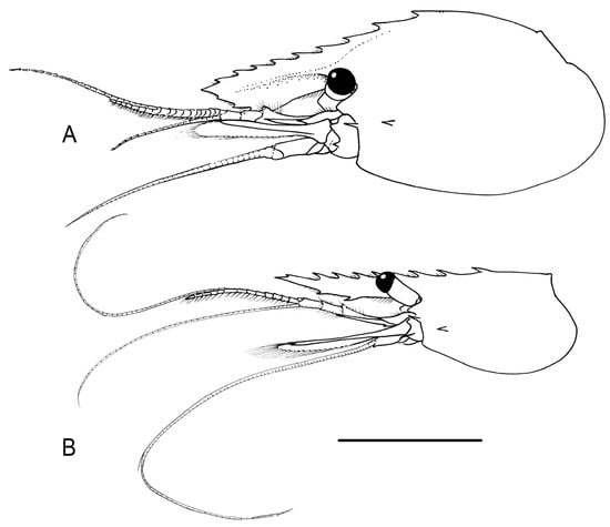 (A) Periclimenes sagittifer (Norman, 1861), ovigerous female, pocl. 6.1 mm, RMNH.CRUS.D.37932; (B) P. scriptus (Risso, 1822), ovigerous female, pocl. 4.1 mm, RMNH.CRUS.D.57271. (A,B) Carapace and anterior appendages, lateral view. Scale = 4 mm.